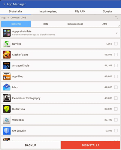 Dal menu App Manager sarà invece possibile disinstallare applicazioni o spostare elementi dalla memoria di sistema alla scheda micro SD eventualmente inserita nel dispositivo. È anche disponibile l'opzione di backup che permette di selezionare alcune applicazioni per le quali conservare sul dispositivo mobile anche il file di installazione APK velocizzando quindi operazioni di installazione e disinstallazione.