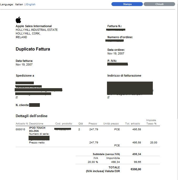 vendo iPod Touch 8Gb acquistato online sull'Apple Store a Novembre ed utilizzato 4 o 5 volte, sulla parte anteriore ha ancora la pellicola originale mai tolta, nessun graffio + custodia Griffin specchiata in omaggio, con fattura dell'Apple Store prezzo 150€ consegna a mano Napoli e provincia Ecco qualche foto, scusate per la qualità ma ho la fotocamera rotta, ho dovuto farle col cellulare: la fattura si riferisce a 2 ipod acquistati, ma ne vendo uno solo ![]() ![]() ![]() ![]() ![]()