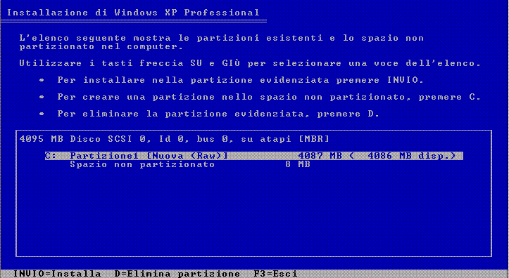 Prima di iniziare una formattazione,devi dire al sistema dove farla,se sei partito con il CD di XP,per formattare,prima devi eliminare la partizione che intendi usare,la devi ricreare e una volta scelta per installare il sistema,sarà automatica la sua formattazione. Questi i passi da seguire: ![]() Non Installare ![]() "D" Elimina partizione ![]() "C" Crea Partizione ![]() Formatta Partizione