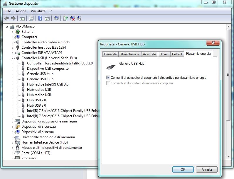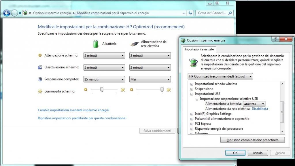 Per quanto riguarda la sospensione e il fatto che alla ripartenza da sospensione non ti funzionino le periferiche: Da gestione periferiche (Start - Esegui - devmgmt.msc - Invio) controlla che sulle varie voci relative al HUB USb non sia spuntata la casella relativa alla voce "Consenti al computer di spegnere il dispositivo per risparmiare energia" ![]() Da "Opzioni risparmio energia" vai su opzioni avanzate e controlla la voce in figura: ![]() Da bios, controlla se lo Standby Mode è impostato su S1 o su S3 Ciao, facci sapere |