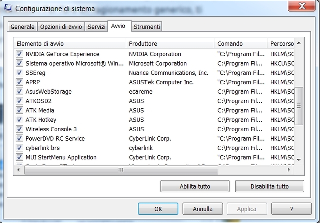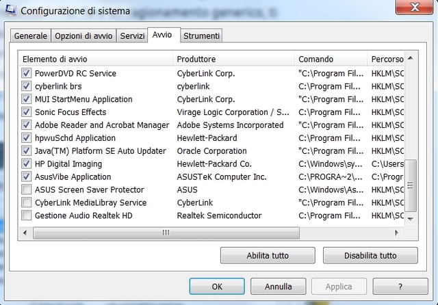 ![]() Puoi cominciare ad eliminare tutti i process asus/HP/Cyberlink/PowerDVD/Adobe. Comunque in generale lascia solo i processi che ti servono, tipo bluetooth se lo usi, altrimenti via, poi quelli del touchpad |