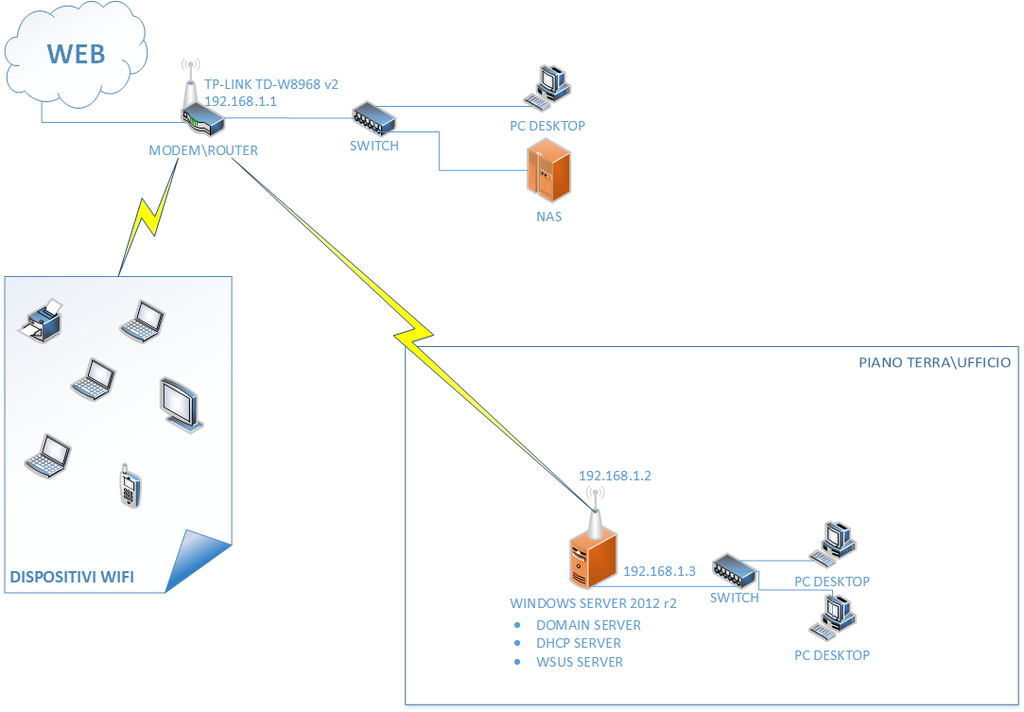 Questo è uno schemino di quanto dovrei realizzare. ![]() Brevemente: . al piano di sopra mi arriva la linea adsl ed il modem/router . internet mi arriva al modem\router (TP-LINK TD-W8968 V2 firmware aggiornato), ho adsl tim 7mb normalissima (e velocissima . il router mi gestisce la Wireless a cui si collegano diversi dispositivi . al router è collegato anche uno switch a cui sono collegati un computer fisso e un nas . al piano inferiore non riesco ad arrivare con una rete cablata . il server win 2012 r2 si collega al router via scheda wi-fi . al server è collegato via ethernet uno switch a cui sono collegati altri pc desktop . al piano inferiore ho necessità di creare una rete che communichi con quella al piano di sopra . vorrei far si che il server gestisse sia il dhcp che un dominio e poterlo poi usare anche come server di distribuzione degli aggiornamenti al momento sono riuscito a configurare parzialmente il server come router, e i pc al piano terra vanno in internet, ma, non comunicano col i pc fuori dalla rete del server, ovvero quelli al piano superiore o wifi. impostando sul router il dhcp come relay e dando l'indirizzo ip del server (l'ip wifi) funzionava parzialmente, il server gestiva tutti gli ip ma... le 2 reti non communicano. Inoltre sul router mi viene indicato di disattivare la NAT ma non riesco a capire come, il wan service settato come PPPoE per collegarmi ad internet e non mi da l'opzione per disattivare la NAT. In pratica, coi pc collegati al router non pingo i pc collegati al server e viceversa. Dal piano superiore pingo la scheda wifi del server (192.168.1.2) ma non quella ethernet (192.168.1.3) e dal piano inferiore pingo la scheda ethernet del server ma non quella wifi. Ma quelli al piano inferiore pur non pingando neppure il router (192.168.1.1) vanno in internet... quindi tecnicamente ci passano per il router. E qui mi sono piantato e non so come uscirne! Forse dovrei gestire il tutto come 2 sottoreti separate, l'ideale sarebbe 192.168.1.x al piano superiore e wifi e 192.168.2.x tutto ciò che viene collegato al server... funzionerebbe? se si come??? avrei preferito avere un solo scope DHCP riservando solo gli IP ai dispositivi fissi, e assegnado ip in lease a disposiviti "di passaggio" NB: 250 IP sono più che sufficienti per me