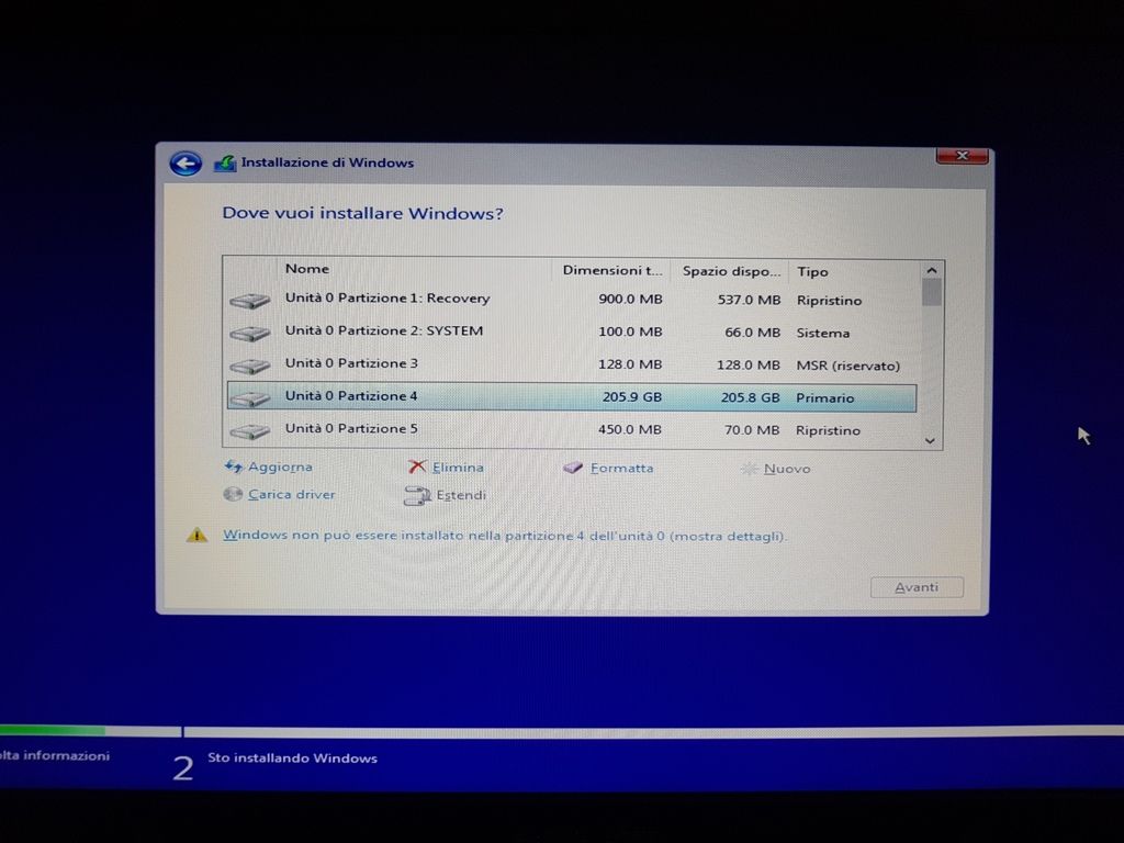 Ad esempio, se ricevi il messaggio di errore "Impossibile installare Windows nel disco. Per il disco selezionato è impostato un tipo di partizione GPT”, è perché il PC è avviato in modalità UEFI ma il disco rigido non è configurato per la modalità UEFI. Hai diverse opzioni: >>> https://msdn.microsoft.com/it-it/library/dn336946.aspx