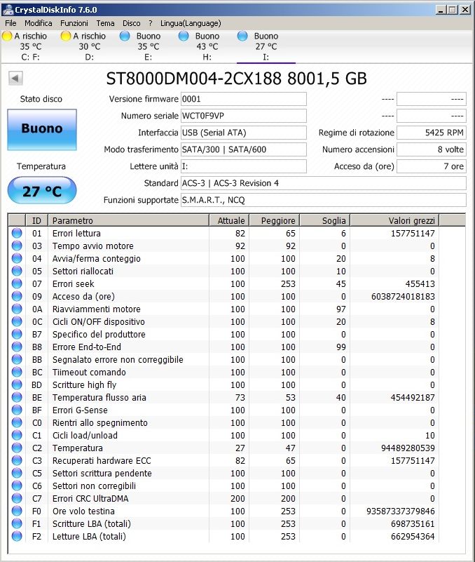 La voce acceso da (ore) non è giusta . Ma forse queste bizzarie escono proprio perchè è un Seagate . Al limite prova a vewdere con un altra marca di hd . Io ho un hd Seagate esterno da molto tempo, la voce Avvio/fermo conteggio che si riferisce alla voce Numero accensioni, non corrisponde . La voce acceso da (ore), corrisponde . L' importante è che funzioni e che non abbia settori danneggiati
