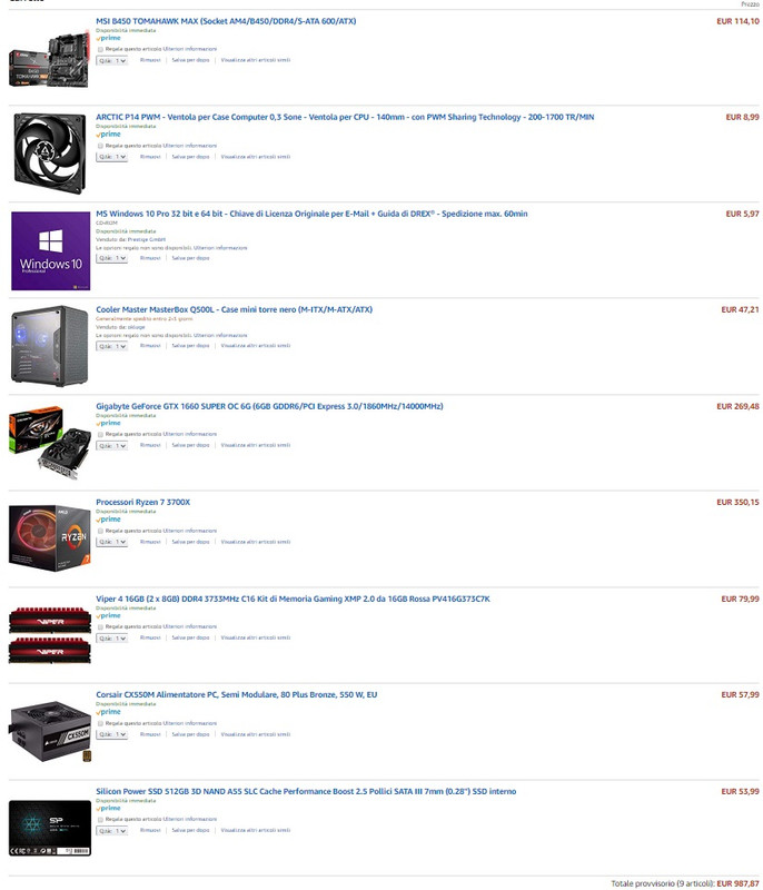 _____________________________________________________ MSI B450 TOMAHAWK MAX (Socket AM4/B450/DDR4/S-ATA 600/ATX) ARCTIC P14 PWM - Ventola per Case Computer 0,3 Sone - Ventola per CPU - 140mm - con PWM Sharing Technology - 200-1700 MS Windows 10 Pro 32 bit e 64 bit - Chiave di Licenza Originale per E-Mail + Guida di DREX® - Spedizione max. 60min Cooler Master MasterBox Q500L - Case mini torre nero (M-ITX/M-ATX/ATX) Gigabyte GeForce GTX 1660 SUPER OC 6G (6GB GDDR6/PCI Express 3.0/1860MHz/14000MHz) Processori Ryzen 7 3700X Viper 4 16GB (2 x 8GB) DDR4 3733MHz C16 Kit di Memoria Gaming XMP 2.0 da 16GB Rossa PV416G373C7K Corsair CX550M Alimentatore PC, Semi Modulare, 80 Plus Bronze, 550 W, EU Silicon Power SSD 512GB 3D NAND A55 SLC Cache Performance Boost 2.5 Pollici SATA III 7mm (0.28") SSD interno _____________________________________________________ Sei sicuro che il NVME sia supportato da quella mobo? non trovo scritto niente da nessuna parte sul sito web msi. Il budget massimo è già stato ampiamente demolito, sono a 980 euri adesso, dovevo stare sotto ai 700... quindi direi che non si può salire nemmeno un euro dal setting attuale, al massimo scendere cambiando brand per la 1660super ma deve rimanere a 2 ventole. Ram pensavo a 3733mhz perchè ho letto essere la velocità massima teorica ideale ma anche a 3600mhz possono andare bene direi... credo Inizialmente avevo pensato ad un ryzen5 3600 ma sono voluto passare al ryzen7 3700x per via del maggior numero di core visto che mi è presa questa nuova fissa della virtualizzazione di macchine operative da hackare e proteggere in locale credo che il multicore si faccia sentire notevolmente, senza poi pensare che il multicore in ambito inventor/solidworks conta eccome. p.s. = black friday totalmente inutile finora per chi si deve fare un pc! gran pubblicità per niente Ultima modifica di grezzz : 25-11-2019 alle 18:07. |