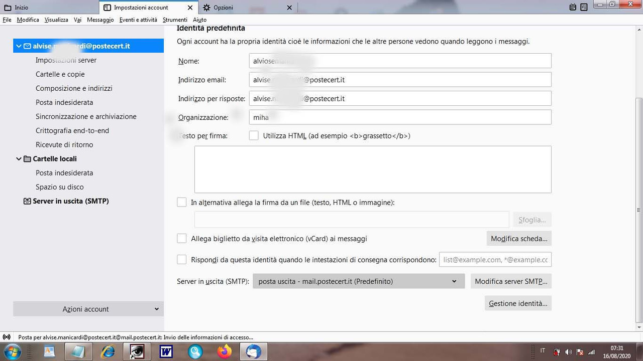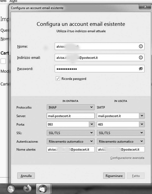 Ho sempre configurato TB nel mio pc,da parenti,amici,ed è andata sempre a buon fine,ma da molti giorni il client mi da l'errore (o messaggio) "thunderbird non riesce a rilevare le impostazioni per l'account di posta".Non ho nessun proxy,so a malapena a cosa serve.Il problema è che TB non dice cos'è che non riesce a rilevare,o cos'è che manca nei dati della configurazione.Avevo configurata una PEC, e stavo ri:configurandolo perchè si era aggiornato e quindi la PEC non funzionava più,quando mi è comparso il messaggio.Ho cercato in rete,ma ho trovato solo estenuanti manuali, che non sono serviti.Qualcuno può aiutarmi?