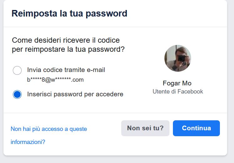 Ti ringrazio, l'avevo già letto e non ci avevo capito molto. Mi chiede di cambiare password, ma come posso cambiarla se non posso entrare nel mio account Facebook? Non so più che fare. Mi sto mangiando il fegato.