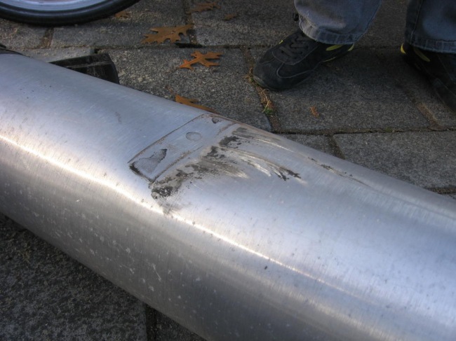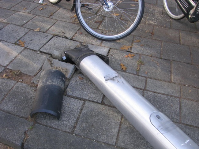 Io continuo a credere che una macchina abbia travolto il palo (si vedono chiaramente dei segni verticali dal basso verso lìalto nella prima foto che ho postato).