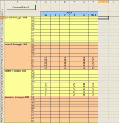 - Su [I4] faccio un bel Menu/Finestra/Blocca Riquadri, in modo da rendere scorrevole la tabella oraria e non perdere il riferimento con le aule. La riga 1 è libera per l'inserimento di eventuali pulsanti che così rimangono sempre in primo piano. - La tabella si genera velocemente : basta creare il primo giorno del mese, poi trascinare in basso la grande cella quadrata con il giorno [A4] per generare tutte le altre. Per il Range [B4:H13] basta trascinare in basso premendo CTRL per non incrementare M1, M2 ecc... - A questo punto con VBA posso risalire agli attributi ( giorno, corso, mattina, pomeriggio, aula ) di ogni cella nel Range[A4:H*] semplicemente derivandoli dalle sue coordinate, popolare il mio Array di variabili (Types) customizzate, e infine non dovrebbe essere difficile generare qualsivoglia foglio secondario. |