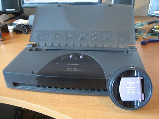 Stampante dalle ridotte dimensioni 30 x 15 x 5cm, getto d'inchiostro a colori, testina scanner, porta lpt1 oppure infrarossi, testina bianco e nero nuova mai aperta con cartuccia e testina a colori con cartuccia nera nuova (quella a colori penso sia esaurita o secca). I driver sono scaricabili dal sito Canon.
