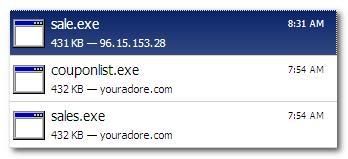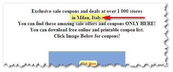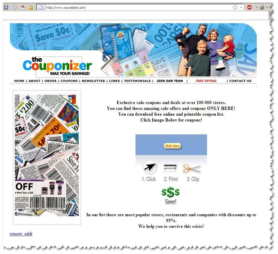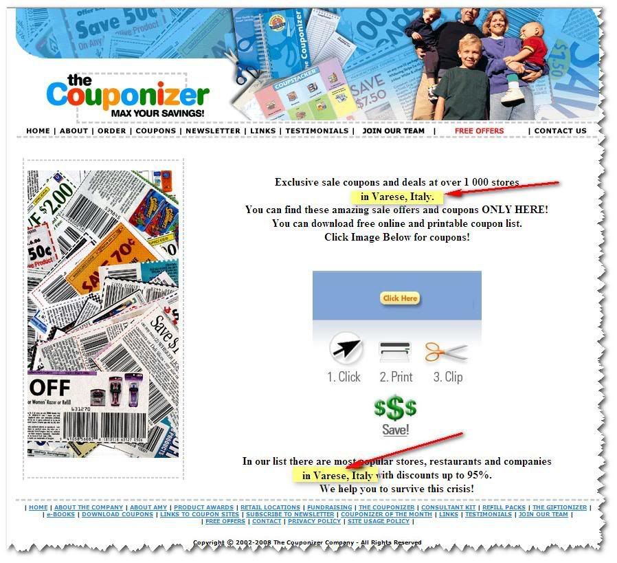 Ricordo come sempre che i domini elencati nel post sono attivi e linkano a file malware. Prendete quindi tutte le precauzioni del caso (noscript, sandboxie o pc virtuale) se volete esaminare i links proposti e il relativo file. MCAfee blog riporta, al riguardo della nuova pagina Waledac, alcune novita' Il testo visualizzato sarebbe adesso infatti modificato ad ogni caricamento della pagina in maniera da localizzare le offerte a seconda della provenienza geografica del visitatore. In pratica, dall'esempio presentato sul blog, il testo conterrebbe nomi di citta' che cambiano per differenti IP di provenienza. Questo potrebbe significare che si cerca di allargare l'interesse per il falso sito 'couponizer' al di fuori del territorio USA presentando offerte commerciali 'personalizzate' a seconda della nazione di provenienza del visitatore della pagina. Nello stesso articolo MCAfee avverte anche della presenza di un Iframe che conterrebbe exploit pericoloso. Al momento di scrivere il post, caricando alcune pagine Waledac la geo localizzazione non sembrava essere attiva ed anche non era possibile rilevare la presenza di un exploit collegato all'iframe contenuto nella pagina. E' interessante notare che sono stati creati nuovi nomi di dominio che richiamano l'argomento trattato dalla nuova pagina e cioe' la distribuzione dei 'coupons' di sconti e delle offerte commerciali Codice: