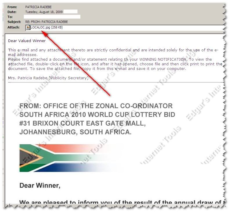 Dopo un periodo di relativa calma, ecco riprendere l'invio di mails di scam, che, questa volta, prendono come spunto una lotteria collegata ai Mondiali 2010 in Sud Africa. Ricordo che: Scam e' un termine che indica un tentativo di truffa con i metodi dell'ingegneria sociale, effettuato in genere inviando una e-mail nella quale si promettono grossi guadagni in cambio di somme di denaro da anticipare. Spesso scam e spam sono strettamente correlati. (da Wikipedia) Ecco un dettaglio della mail ricevuta il cui layout e' composto in parte da testo ![]() e da una immagine jpg allegata, che costituisce il messaggio vero e proprio: (jpg sul blog) Come sempre si succede in questo genere di scam, che richiama in parte la nota truffa alla Nigeriana (detta anche Scam 419) , si informa di una vincita da un milione di dollari che verra accreditata rispondendo appunto alla mail. Di solito a chi rispondesse alla mail verranno richieste somme di denaro come anticipazioni per il pagamento delle pratiche burocratiche necessarie all'accreditamento della falsa vincita. C'e' infine da ricordare che, visto il testo completamente in lingua inglese, sembrerebbe comunque un genere di scam non espressamente rivolto ad una 'utenza italiana' della rete. Edgar fonte: http://edetools.blogspot.com/2009/08...p-lottery.html |