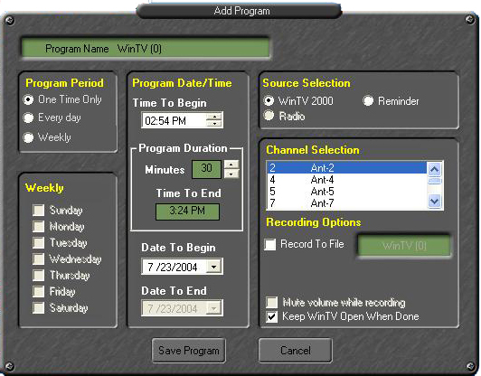Vi espongo il mio problema. Ho una chiavetta dvb-t terratec Cinergy T Stick RC , sto usando il software terratec dvbviewer, per quanto riguarda la visualizzazione e la ricezione dei canali non ho problemi, il mio problema sta nella programmazione delle registrazioni che funzionare funziona ma ha un interfaccia orribile e poco userfriendly con una selezione dei canali orribilmente vasta con voci multiple tipo "italia1(ita)"che si espande e dentro ha "italia1(oth) e italia1(eng)...mi è capitato di vedere lo scheduling per le rigistrazioni di un ricevitore WinTV ed è molto più pratico..mi servirebbe una cosa del genere, che voi sappiate ne esistono di compatibili con il mio ricevitore? Registrazione DVBViewer ![]() Registrazione WinTV