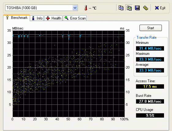 Ho un HDD esterno 2,5" Toshiba 1TB USB 3.0 collegato a un hub USB. Da qualche giorno ho problemi (all'accensione dell'hub il disco non viene riconosciuto), ma sospetto sia l'hub stesso la causa. Ho collegato il disco a una presa USB 2.0 del case (presa "derivata", non direttamente sulla scheda madre) e ho fatto un test con HD Tune: ![]() Questi valori possono essere considerati nella norma? |