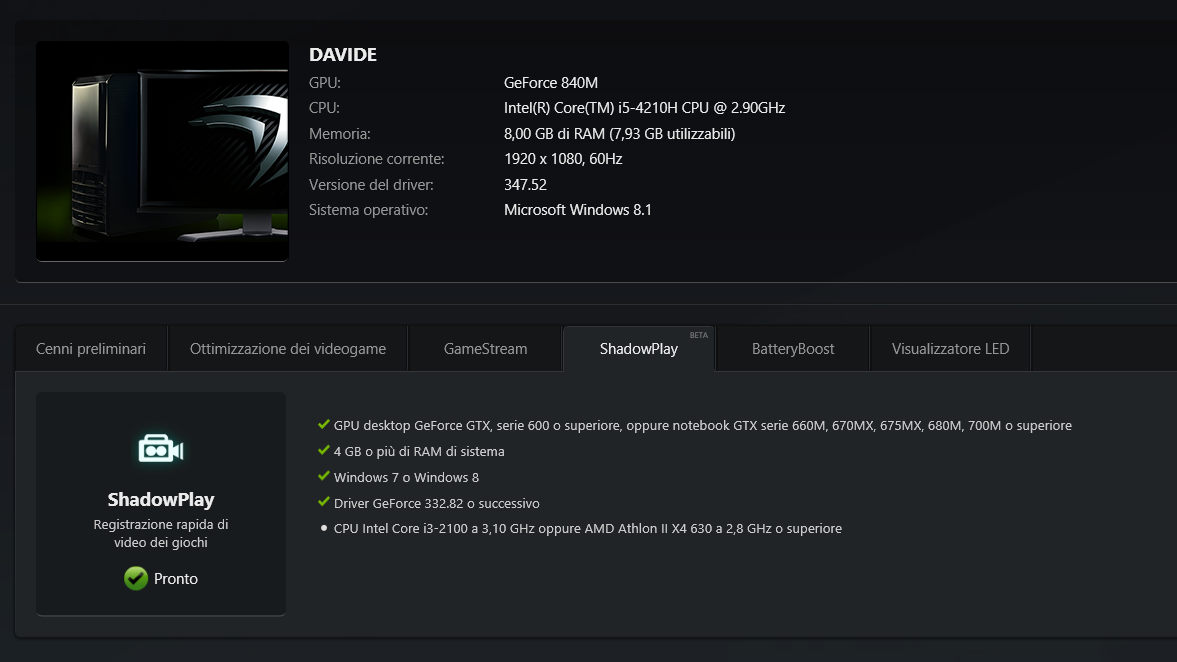 Interessante la schermata di geforce experience, io ho un portatile asus jk550 per muletto, monta una 840m come il tuo ma a me il programma mi dice che non e' abilitato a Shadowplay