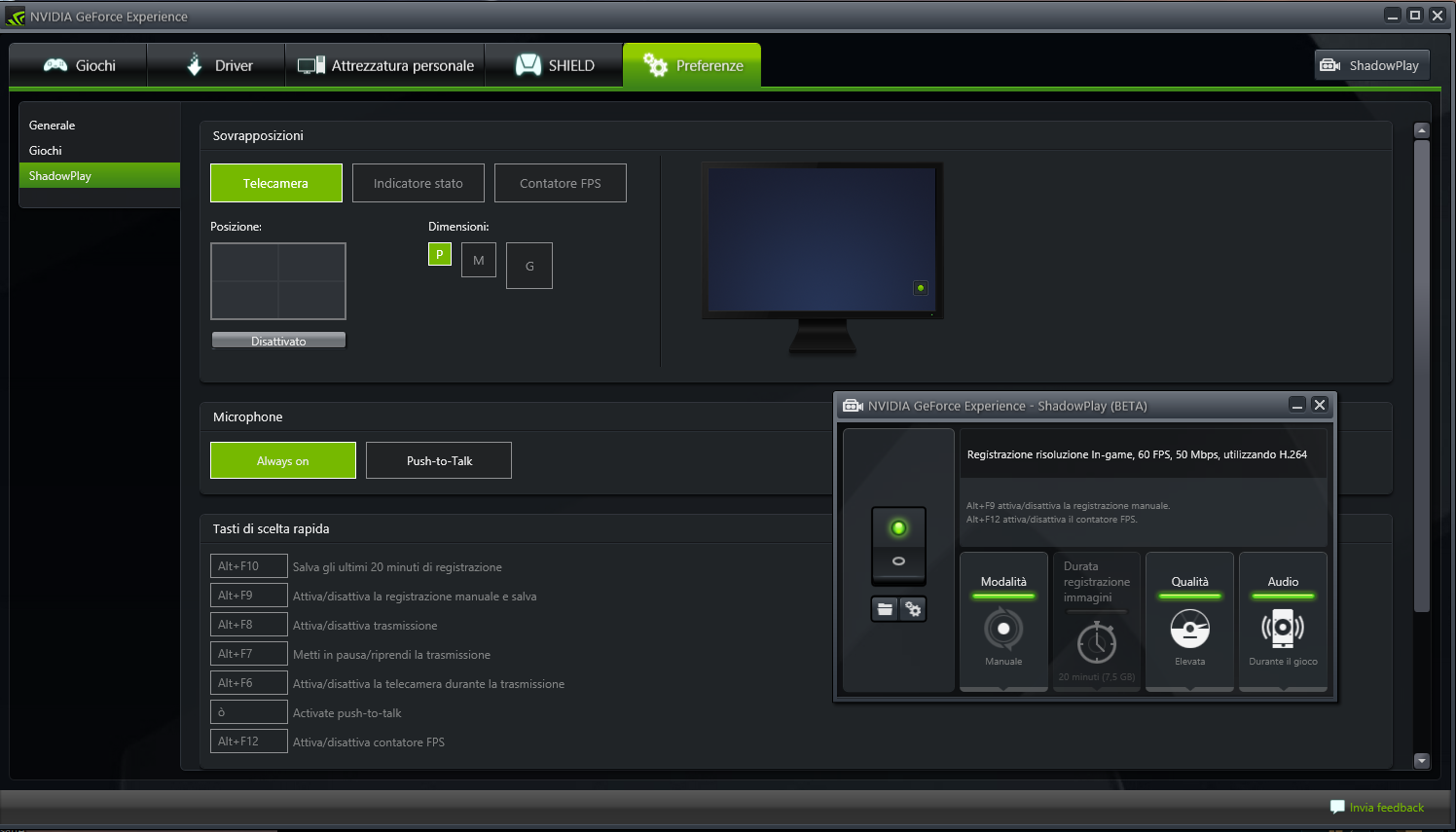 io faccio così: click su shadowplay in alto a destra, lo accendo e abilito la modalità manuale. Poi su Preferenze\Shadowplay spunto su Consenti cattura desktop. Sulla stessa finestra puoi personalizzare tasti rapidi, cartelle, contatore fps ecc..