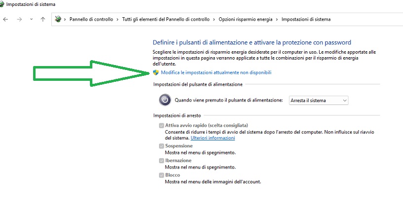 ![]() Il Percorso per arrivare alla finestra di cui sopra è > Pannello di controllo-Opzioni risparmio energia-Specifica cosa avviene quando si preme il pulsante di alimentazione . Se vuoi disattivare tutte le voci o solo alcune, vai alla voce indicata dalla freccia Verde