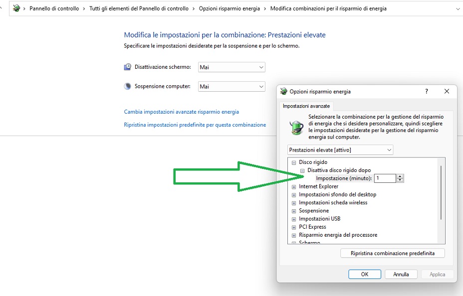 Se vai in Opzioni risparmio alla voce > Disattiva disco rigido dopo La voce si riferisce, se hai degli HD esterni collegati, Non riguarda il disco dove c'è il SO .