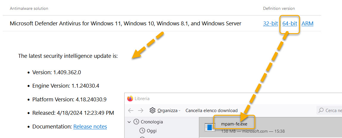 In effetti adesso ho effettuato una nuova installazione manuale dell'ultimo mpam-fe.exe ed ora mi ritrovo con: AMEngineVersion : 1.1.24030.4 AMProductVersion : 4.18.24030.9 AMRunningMode : Normal AMServiceEnabled : True AMServiceVersion : 4.18.24030.9 AntispywareEnabled : True AntispywareSignatureAge : 0 AntispywareSignatureLastUpdated : 27/04/2024 08:03:26 AntispywareSignatureVersion : 1.409.552.0 AntivirusEnabled : True AntivirusSignatureAge : 0 AntivirusSignatureLastUpdated : 27/04/2024 08:03:25 AntivirusSignatureVersion : 1.409.552.0 il che è perfettamente coerente con: Latest security intelligence update The latest security intelligence update is: Version: 1.409.552.0 Engine Version: 1.1.24030.4 Platform Version: 4.18.24030.9 Released: 4/27/2024 12:54:10 PM Documentation: Release notes della pagina Microsoft. Grazie