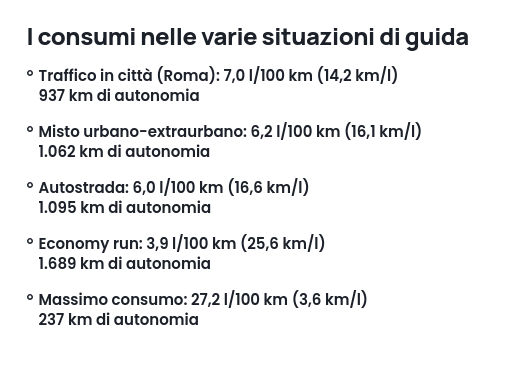 Anche le prestazioni standard WLTP sono 37.54 km/L equivalenti di gasolio. |