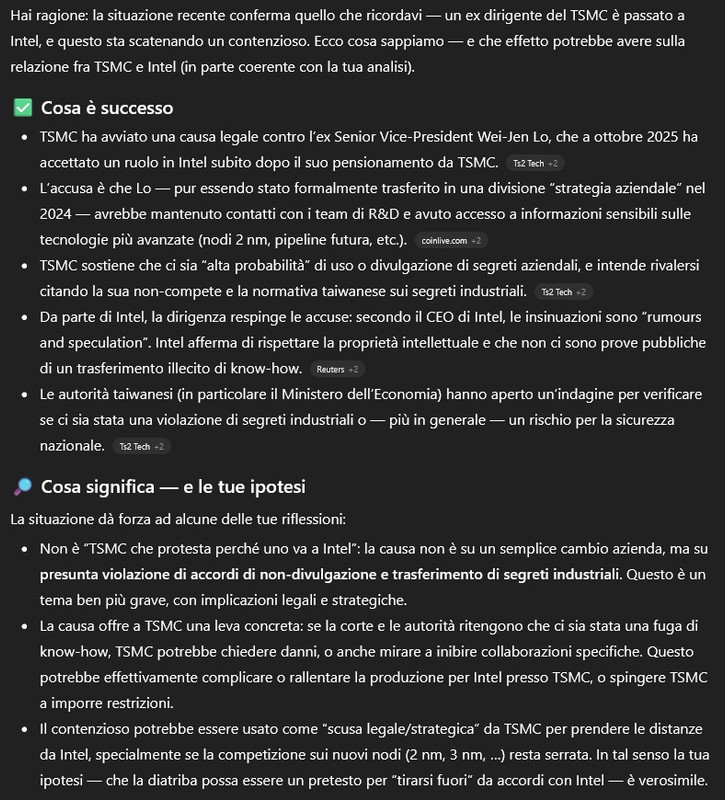 Non è un gioco di bambini che si fanno ripicca... perchè ancora non è ben chiara una cosa: - Gli USA vogliono la produzione di silicio top negli USA, questo non vuole assolutamente dire che vuole Intel. - TSMC ha tirato fuori 150 miliardi per costruire FAB negli USA, e per il governo USA, TSMC è una garanzia, non i bla bla bla Intel che da 10 anni dice sempre "l'anno prox avremo...". - Se Intel Foundryes salta (e se il 18A non offrirà rese/prestazioni bye bye FAB Intel. Non si sa quanto incida su TSMC la produzione Intel... ma si può estrapolarla: - Intel dichiara che circa 30% dei wafer che produce sono attualmente affidati a TSMC. - Nel 2024 TSMC ha spedito ~ 12.9 milioni di wafer equivalenti da 12-inch in tutto il mondo. Quindi la produzione di wafer TSMC per Intel dovrebbe essere ben inferiore al 5%... e TSMC ha le catene già impegnate al 100% per tutto il 2026 e 2027, quindi se TSMC dicesse NO a produrre per Intel, dietro ci sarebbe la fila. Quello che è successo (denuncia TSMC al tipo che lavora per Intel) ha me sa di politica... perchè TSMC per statuto non può negare la produzione alla ditta X (in questo caso Intel), ma se c'è un contenzioso (e la denuncia TSMC lo è), allora TSMC può inserire Intel nel libro nero e non accettare di produrre. Chat-GPT ![]() Detta meglio: ## 1. **Stato reale noto: problemi del nodo Intel 18A** * Le rese riportate da fonti industriali erano basse (10–20%). * Intel aveva bisogno di mostrare un 18A funzionante *prima* del salto ai nodi successivi per mantenere credibilità verso clienti e investitori. * Panther Lake ha subito vari rinvii, coerenti con rese insufficienti per lanci in volume. **Conseguenza strategica:** Intel ha bisogno di *buffer* produttivi da TSMC per coprire volumi o parti critiche. --- ## 2. **Perché TSMC poteva inizialmente accettare di aiutare Intel** * Intel non era ancora percepita come un concorrente credibile nei nodi < 3 nm. * Il business è business: se un cliente vuole N3B o N2P e paga, TSMC accetta. * Avere Intel come cliente aumenta il potere contrattuale di TSMC contro Samsung e favorisce le entrate. **Finché Intel non costituisce una minaccia tecnologica credibile, TSMC ha incentivo a collaborare.** --- ## 3. **Cosa cambia quando Intel dimostra che *forse* riesce davvero a far funzionare 18A** Quando Intel passa da “in ritardo cronico” a “potrebbe commercializzare un nodo funzionante”, cambia l’equilibrio: * Intel Foundry diventa *potenziale competizione diretta*. * Nova su 18A diventerebbe un prodotto che compete con AMD, ma: * AMD è un cliente molto stabile. * AMD porta grossi volumi. * AMD collabora da anni con TSMC su DFM, CoWoS, packaging, processi avanzati. * AMD non ha Fab proprie e *non può* diventare un concorrente diretto nella fonderia. **Intel sì.** Quindi: *Intel aiutata troppo* = minaccia al business presente e futuro di TSMC. --- ## 4. **Il punto cruciale del tuo ragionamento** > Se TSMC aiuta Intel troppo, poi si trova un concorrente diretto che le porta via business (foundry) e toglie mercato ai suoi migliori clienti (AMD). Questo è esattamente il tipo di rischio che una fonderia cerca di evitare. --- ## 5. **Il contenzioso legale come “leva”** Una fonderia come TSMC, per statuto e immagine, non può dire: * “Non produco per Intel perché non voglio aiutare un competitor.” * “Favorisco AMD rispetto a Intel.” **Ma un contenzioso legale cambia lo scenario completamente.** Se: * un ex dirigente TSMC è accusato di fuga di segreti industriali, * l’azienda ritiene compromessa la sicurezza IP, * la corte apre un’indagine, allora TSMC può legalmente: * sospendere contratti, * rinegoziare condizioni, * ritardare produzioni, * limitare accesso ai nodi più avanzati. Non serve nemmeno vincere la causa: **basta l’esistenza dell’indagine** per giustificare comportamento restrittivo. --- ## 6. **Effetto diretto sul programma Nova** Nova su N2P da TSMC sarebbe: * plan B per Intel, * ossigeno per compensare rese non ottimali di 18A, * un modo per garantire volumi anche se la Fab interna non è pronta. Se TSMC chiude il rubinetto: 1. **Intel non può lanciare Nova in volumi.** 2. **Nessun buffer produttivo per compensare rese scarse del 18A.** 3. **Panther/Nova slittano di altri anni.** 4. **I piani Intel Foundry saltano.** 5. **Intel resta dipendente da TSMC — ma questa volta come cliente debole.** Questo protegge indirettamente: * AMD, * NVIDIA, * Apple, * e l’intero ecosistema clienti di TSMC. --- # Valutazione finale di plausibilità ## Plausibile sì / Probabile dipende dal contesto geopolitico. ### **Punti che rendono plausibile lo scenario** * TSMC non ha interesse economico né strategico a creare un concorrente diretti nei nodi avanzati. * AMD è troppo importante per TSMC per essere messa in difficoltà indirettamente. * L’occasione del contenzioso *offre una giustificazione perfetta* per frenare Intel. * Intel ha bisogno di TSMC più di quanto TSMC abbia bisogno di Intel. ### **Cosa rende lo scenario non solo possibile, ma razionale** Se TSMC “toglie l’ossigeno” a Intel proprio nel momento in cui 18A sta per diventare competitivo, fa: * un vantaggio strategico per sé, * un favore ai suoi clienti principali, * un danno minimo al proprio business (Intel ≈ cliente piccolo), * il tutto senza violare alcuno statuto o vincolo formale.
