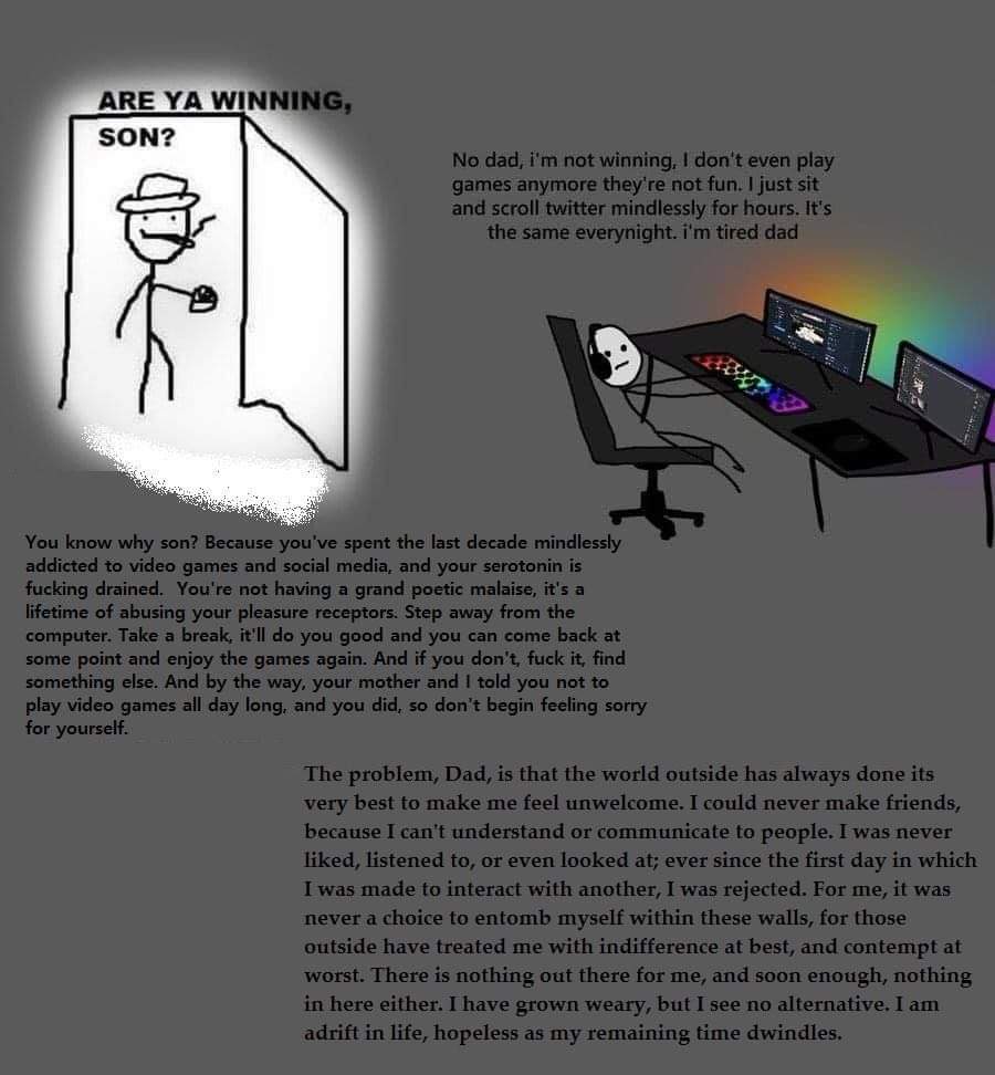 O, meglio, questa immagine, non capisco se: _ vuole forzarsi nel rendere i giocatori eccessivamente asociali / sociopatici [e purtroppo ne conosco] _ è effettivamente creata da una persona che davvero pensa quelle cose, le sente davvero. In ogni caso, Non tutti i giocatori sono così... Sono amantissimo dei videogiochi e giocatorissimo [anche se negli ultimi 5 anni almeno l'80% in meno, ma per questione di tempo, assolutamente non di voglia] da quando ho memoria della mia più lontana infanzia, ma ho una vita sociale forte e sana, grazie al cielo. Ma, comunque: Perché l'hai condivisa? |
