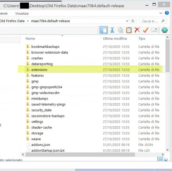 Ho un'installazione di Mozila Firefox ESR che era in uno stato instabile di 'Non risponde'. In fase di disinstallazione mi è stato proposto il 'Refresh', processo tutto automatico. Questo processo è alternativo alla Disinstallazione. Ma in passato, se ricordo bene, una disinstallazione con successiva re-installazione conserva le estensioni. Ricordo male? Adesso mi ritrovo un Firefox che si apre, ha i Bookmarks ma ha perso tutte le Estensioni che erano installate.. Sul Desktop adesso è presente una nuova cartella: "Old Firexfox Data" ![]() C'è modo di estrarre le estensioni dalla cartella o almeno averne un elenco? Non ricordo proprio le estensioni installate prima del 'Refresh'.... Grazie.