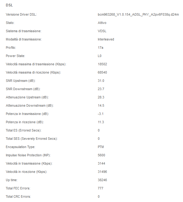 ![]() Probabilmente subirei un ulteriore incremento di massima velocità ottenibile con il profilo 50/10 (o 100/20) rispetto ad adesso, particolarmente in upload, a causa dell'aumento di potenza in uscita. Sono comunque curioso di vedere come si presenterà la situazione dei FEC/CRC col profilo 100/20, visto che già adesso la linea fa un po' di errori col passare del tempo. |