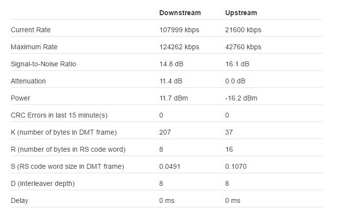 Modalità DSL ITU-T G.993.2 Annex B (VDSL2) Lo stato della linea DSL Connesso Bit rate corrente 21600 [kbps] / 107001 [kbps] G.INP / Massimo bit rate ottenibile 33014 [kbps] / 109439 [kbps] Margine di rumore 11.4 [dB] / 6.2 [dB] Potenza trasmessa in linea -21.2 [dBm] / 12.3 [dBm] Ritardo effettivo 0 [ms] / 0 [ms] Protezione Rumore Impulse 59 [DMT symbols] / 61 [DMT symbols] attenuazione loop 1.6 [dB] / 5.7 [dB] |