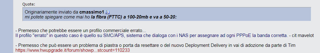 Quindi chiamo il commerciale (anche io ho avuto problemi a contattarli, pare che as econda dell'orario, le opzioni automatiche del 187 cambino): la prima risposta è che "a me risulta una richiesta di attivazione della MAX VEL INTERNET, quindi spetta al servizio tecnicno fare questa operazione", ed ovviamente era inutile spiegarle che in tre mi avevano confermato che invece spettava a loro darne comunicazione; la seconda operatrice, stavolta dalla Romania, invece mi dice subito "vedo una richiesta pendente di attivazione del profilo 35b, gliela attivo subito": tempo di uscire di casa a sbrigare due cosa, al rientro il nuovo profilo era attivo, e la velocità era passata da 53MBps di prima (la mia linea soffre di una notevole diafonia, a quanto pare) ai 105 di adesso. Il problema è che, pur con il profilo 35b attivo (risulta dll'app MyTIM FIsso), la mia connessione è ancora indicata come FTTC100, anziché FTTC200, quindi credo che mi toccherà fare un altro giro di rodeo al 187 ![]() ![]()