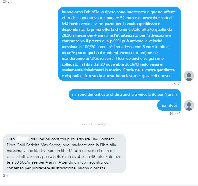 Se poi leggi bene il dettaglio dice Se invece, in alternativa alla modalità autoinstallante, richiedi l'intervento del tecnico a casa, usufruirai del servizio TIM Expert base al costo di 169€ da corrispondere in unica soluzione (non rateizzabile). quindi tecnicamente se metti il tuo attuale numero telefonico e codice fiscale potrai vedere che questa opzione non c'è. Il mio consiglio è di verificare se vi sono altri operatori che hanno fatto dei lavori per mettere la propria fibra ottica (Planetel? Open Fiber? Fastweb?). Io aspetto martedì prossimo poi mando la disdetta TIM. Se invece voi avere TIM a tutti i costi, ti suggerisco di scrivere al loro account TIM su Twitter e fare una controproposta. Provare non costa niente. |