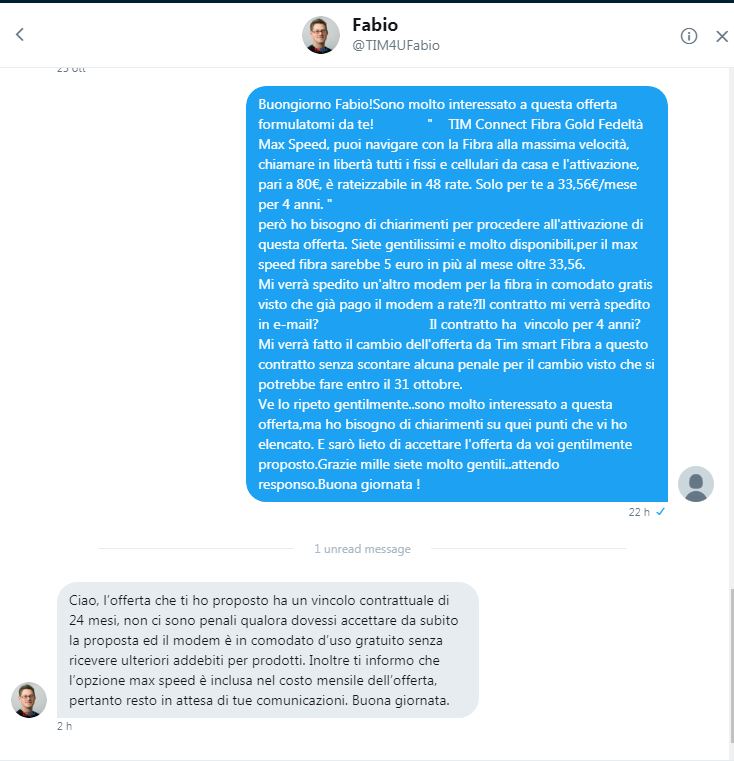 Ragazzi ho attivato fibra 30/3 con la connect gold il 15 ottobre tramite tecnico che mi ha consegnato il modem Hub. Giá il giorno dopo ho chiamato per la 100, cosa che avevo chiesto dall'inizio ma l'italiano per loro è un problema, insomma mi hanno detto si può fare ecc ecc.. Poi dopo 2/3gg ho richiamato perchè nell'app my tim fisso non compariva niente della chiamata che avevo fatto, cosí anche lui mi ha detto si si ma deve aspettare, su my tim fisso non viene scritto niente, quá la pratica la vedo ma la devono o chiamare o ricevere l'sms di avvenuta attivazione. Domanda: aspetto ancora o richiamo per rompere le balle? Mi diceva che si prendono fino a 30gg