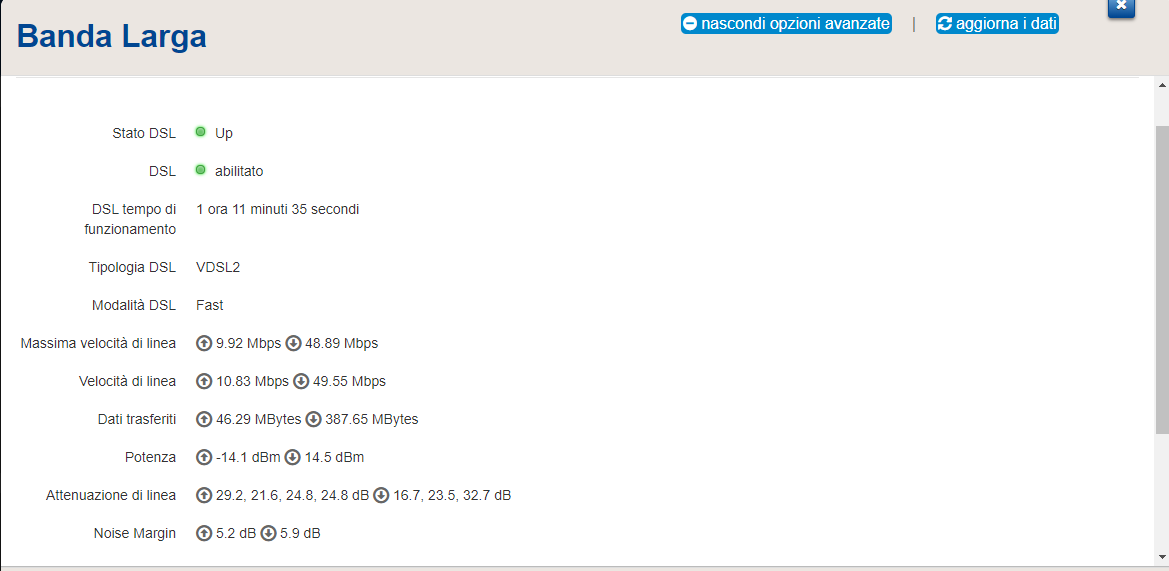 Profilo: EVDSL 35b Velocità corrente downstream: 49,56 Mbps Velocità corrente upstream: 10,84Mbps Margine di rumore downstream: 5,9dB Margine di rumore upstream: 5,3dB Attenuazione downstream: 16,7dB Attenuazione upstream: 29,2dB Potenza downstream: 14,5 dBm Potenza upstream: -14 dBm Tutto normale ? |
