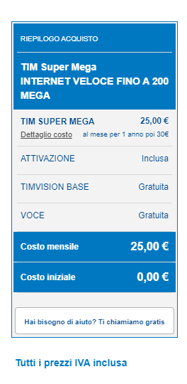 Avresti altresì sempre una 100 Mega, se il tuo armadio è a 100 Mega. Inoltre per i nuovi clienti Tim, la promo Tim Super costa 25 Euro/mese x 12 mesi, dopodichè 30 Euro/mese, senza modem Tim a rate e con un'opzione a scelta del cliente inclusa gratis (ad esempio l'opzione Voce per le chiamate gratis). Lascia perdere il call center e tutti gli altri che ti chiameranno; loro per aumentare la provvigione ti inseriranno il modem Tim a rate pari a 5 Euro/mese x 4 anni. Fai tutto da sito Tim. Se farai tutto correttamente, il riepilogo costi ti uscirà così: ![]() Il modem (se non hai già un FritzBox di proprietà) te lo prenderai per fatti tuoi, nella fattispecie un Tim Hub a 50 Euro circa sulla baia e sarai a posto. Ultima modifica di Bigbey : 16-11-2019 alle 10:52. |