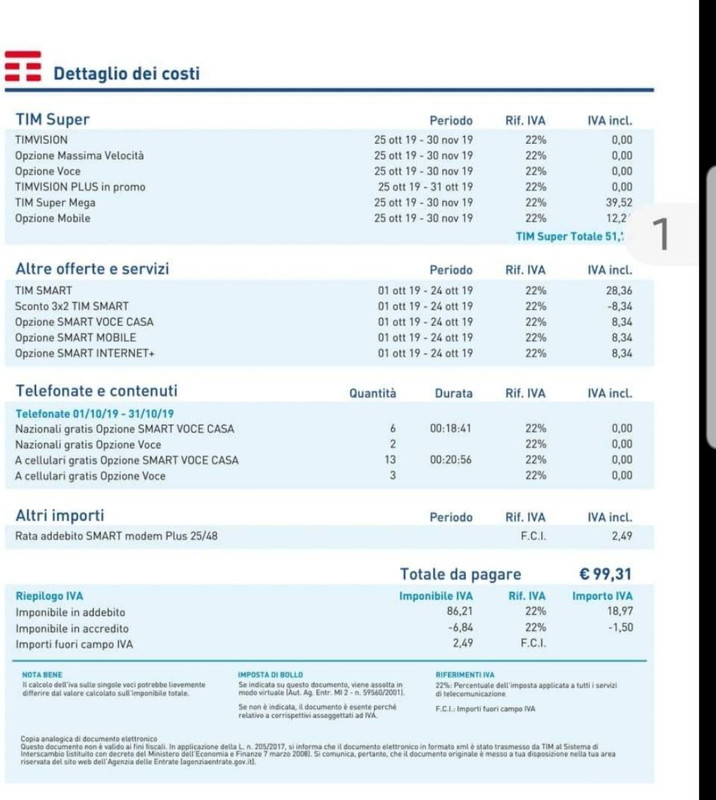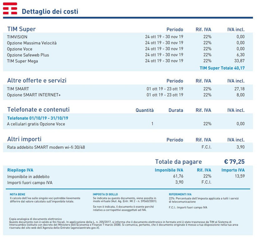 arrivata anche a me la prima bolletta di passaggio, non mi tornano gli importi, togliendo il mese anticipato, dall' 11 ottobre al 31 ottobre sono 21 giorni quindi dovrebbero essere più di 40.15 - 30 (di novembre) = 10.15 euro, il resto sembra corretto, a parte che la mia ex TIM SMART INTERNET+ 200 è diventata TIM SMART + Opzione SMART INTERNET+