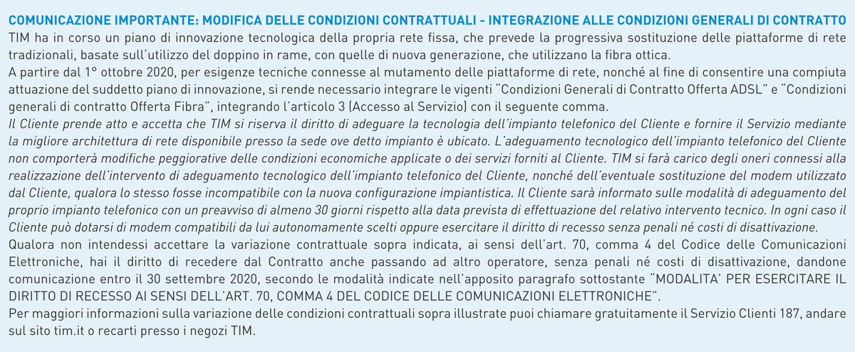 Si coprono contrattualmente per ogni intervento di adeguamento da oggi al ... 2023. Però dovrebbero darti preavviso di 30 giorni per accettare adeguamento a FTTx. Mentre la scadenza per passare ad altro operatore ex art. 70 c4 ormai è scaduta. Per la scelta di modem a partire dai modelli offerti da Tim, trovi in prima pagina l'apposito post #3. Poi ci sono tutti gli altri la scelta del modem con o senza router. Ultima modifica di giovanni69 : 20-10-2020 alle 17:52. |