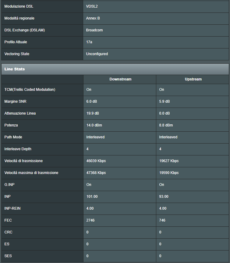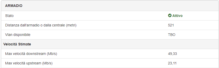 Dovrei avere una TIM 100/20, distanza pedonale da Maps di 550mt, da Fibermap invece: ![]() di fatto da speedtest arrivo a 42/18.5. Queste sono i parametri mostrati dalla GUI del modem: ![]() Secondo voi è plausibile che ci siano problemi? Da quel che ho letto dovrei ""teoricamente"" agganciare qualcosa di più, ma non son sicuro di aver capito bene come leggere i dati...