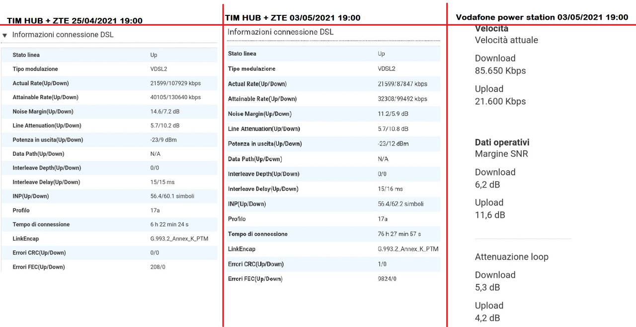 Sono a circa 50-70 m dal cabinet Attivata il 20/04 prendevo 108 mega pieni dal 26-27/04 non vado oltre gli 88 (vanno benissimo) Ho già chiesto a voi e concordate con me nel dire che è diafonia ma vorrei postarvi sotto le statistiche (mooooolto base) del 20/04 e del 03/05 fatte sia con Tim Hub + ZTE che con Vodafone Power Station ![]() ![]() Ultima modifica di Mattemoller90 : 04-05-2021 alle 11:05. |