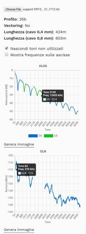 Dall'hlog mi sembra che il primo picco "basso" sia alla portante 330-350, quindi è possibile calcolare facilmente la distanza della derivata dal router. f = Portante 330 x frequenza 4,3125khz = 1423,125 kHz Lunghezza = 200000 / (f x 4) = 200000 / 5692kHz = circa 35 metri. Probabilmente è il giunto in chiostrina appena fuori casa. Per quanto riguarda il grafico del rumore QLN, sei messo abbastanza bene per entrambe. hai un po' di diafonia nella prima parte (frequenze della 17a) mentre per la 35b sei probabilmente uno dei primi utenti attivati sul cabinet. Le velocità sono ottime, considera che rispetto a quanto agganci c'è un overhead 5-6%. Quindi 192M diventano i 180 reali che misuri.
