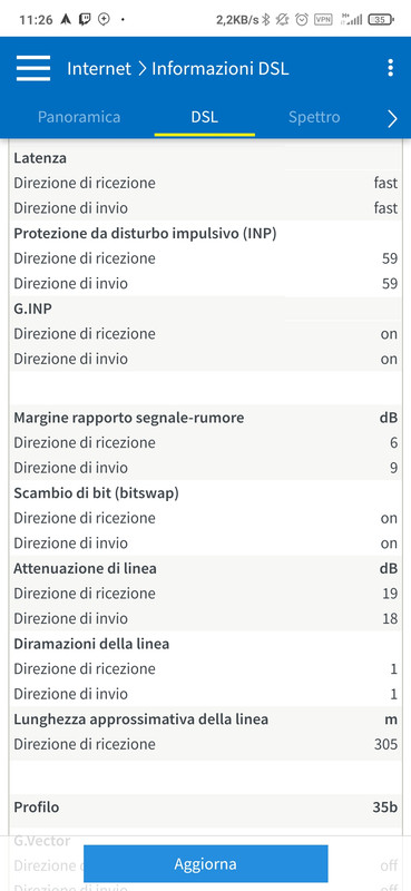 Informazioni connessione DSL Stato linea Up Tipo modulazione VDSL2 Actual Rate(Up/Down) 9403/16453 kbps Attainable Rate(Up/Down) 9477/17551 kbps Noise Margin(Up/Down) 5.9/13.7 dB Line Attenuation(Up/Down) 14.3/40.8 dB Potenza in uscita(Up/Down) 6/18 dBm Data Path(Up/Down) N/A Interleave Depth(Up/Down) 0/0 Interleave Delay(Up/Down) 32/32 ms INP(Up/Down) 112.3/111.9 simboli Profilo 8b Tempo di connessione 1 h 8 min 53 s LinkEncap G.993.2_Annex_K_PTM Errori CRC(Up/Down) 1/517 Errori FEC(Up/Down) 366/0 Aggiungo che per il contratto la connessione è 100 Mb (massimo ovviamente), che mi era stata prospettata una velocità all'incirca di 50 Mb in fase di promozione dell'offerta, che il tecnico che mi ha fatto la conversione della linea mi aveva garantito almeno 30 Mb, che ho toccato i 40 Mb solo il primo giorno dell'attivazione, e che poi la velocità è scesa sempre più fino a diventare in download praticamente un adsl 20 Mb (linea che avevo infatti prima e infatti l'aggiornamento non si sente) che opera all'incirca a 15 Mb reali. Mi è stato anche detto da parte del tecnico installatore che ho un cablaggio vecchio in rame che probabilmente influisce negativamente, tuttavia la centrale Tim più vicina è a 300 mt e l'armadio Tim a cui si connette la fibra è proprio davanti alla mia abitazione. Domanda: dite che si può fare qualcosa? Ho già contattato 187 e tecnico installatore più volte ma per ora non cambia niente se non in peggio. E dire che il profilo attuale si chiamerebbe addirittura Tim Super Xdsl con opzione (udite udite!) Max Speed ![]() Avevo pensato anche a far rifare a un elettricista di fiducia il cablaggio in rame all'interno dell'abitazione, ma non sono sicuro che il guaio sia completamente in carico al cavo di rame, visto che con la vecchia Adsl non c'erano problemi. Boh, io non è che ci capisca molto ma non ho avuto neanche risposte particolarmente utili dall'assistenza, a parte che la mia linea funziona così. ![]() Chiunque voglia dare un consiglio è sempre ben accetto. ![]() Ultima modifica di tailss : 10-06-2021 alle 17:57. |