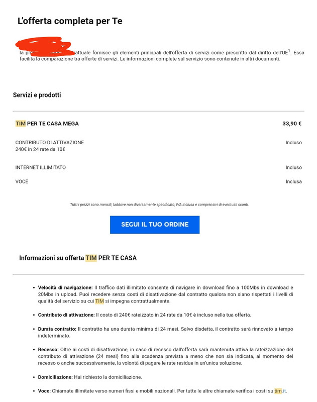 - Tim Super 19,90 Euro/mese x 24 mesi; - Costo di attivazione pari a 10 Euro/mese x 24 mesi; - 1 opzione obbligatoria da sottoscrivere a +5 Euro/mese (a scelta tra Voce, Modem, Smart Home, Safe web plus). - sconto di -5 Euro/mese x sempre nel caso si attivi la domiciliazione dei pagamenti su IBAN o carta (anche una Postepay Evolution va bene); Dopo 24 mesi, la Tim Super aumenta da 19,90 a 29,90 Euro/mese senza più vincoli, penali e costi di attivazione (il totale rimane come è ovvio, sempre invariato). Nel tuo caso che paghi con bollettino, continui a pagare regolarmente 34,90 Euro/mese (Tim Super + Opzione Voce per le chiamate gratis) + da pagare extra modem e repeater, se li richiedi. Non devi fare centomila domande all'assistenza Twitter altrimenti ti blacklistano. Basta scrivere quanto trovi nella guida postata a pag. 1 di questo topic + nel tuo caso il modem e il repeater se li vuoi. Ultima modifica di Bigbey : 04-08-2021 alle 16:54. |