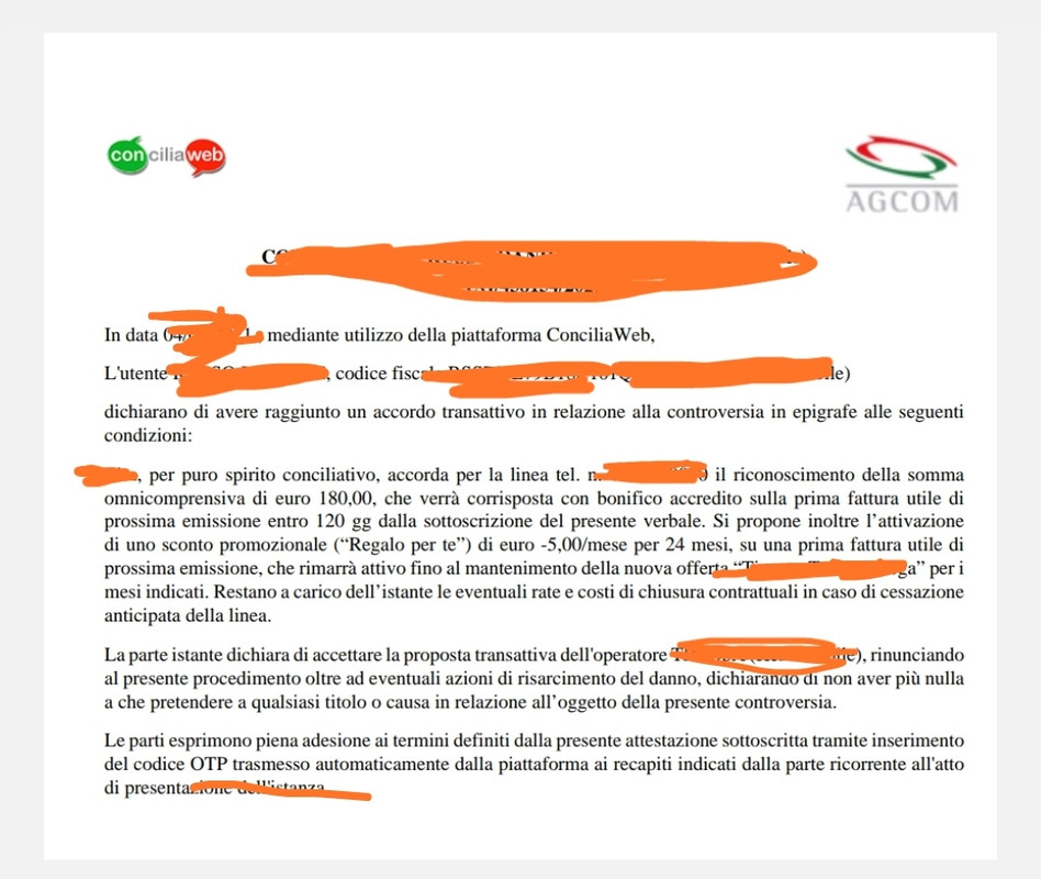 Molto probabilmente ti metteranno i -5 Euro/mese x 24 mesi in fattura, con la voce "Regalo per te" e i 180 Euro, via bonifico...se hai indicato loro delle coordinate bancarie nell'istanza di conciliazione o se hai la domiciliazione attiva con loro. P.S.: Ricorda di accettare la proposta firmando digitalmente il verbale, tramite codice OTP che ti arriva via sms. Ultima modifica di Bigbey : 04-08-2021 alle 21:59. |