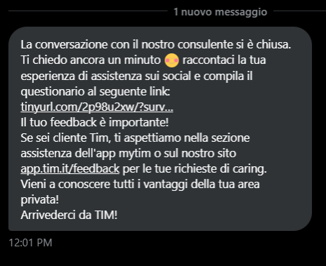 Ieri ho "insistito" con l'assistenza TIM su Twitter e mi avevano risposto chiedendo numero di telefono, nome e codice fiscale dell'intestatario, così sono rimasto in attesa dopo averli inviati. Oggi hanno chiuso la discussione con questo bellissimo messaggio: