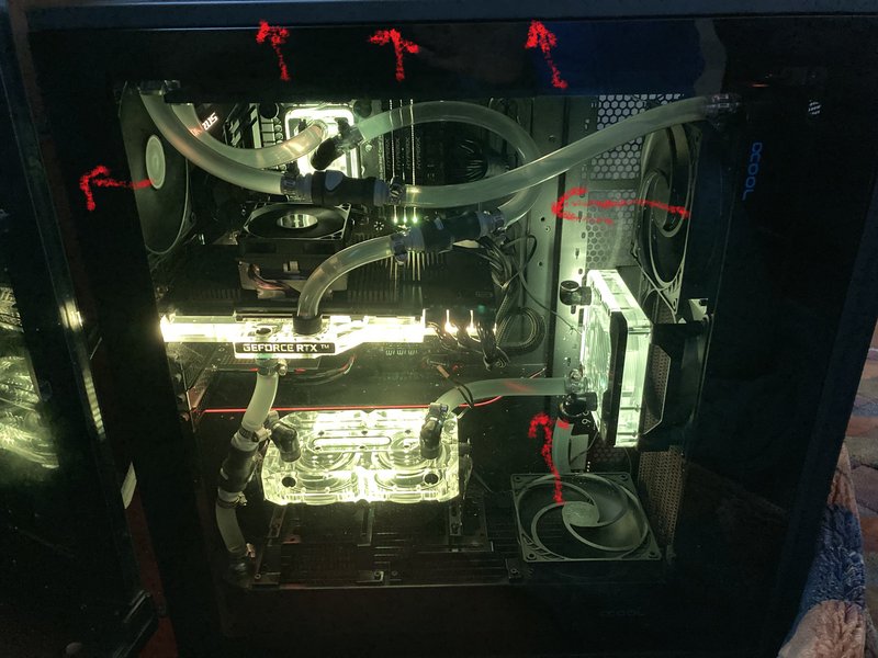 Io ho una config simile a quella che hai disegnato, con in piu' un 360 in basso con ventole push in ingresso, e anche una in pull nel "segmento" verso il front. Allo stesso modo il 420 front ne ha una in pull nel segmento superiore ![]()