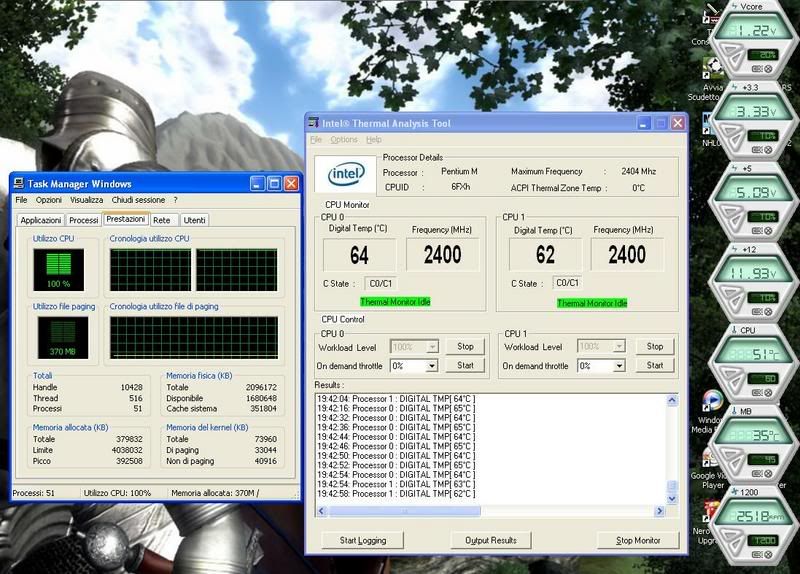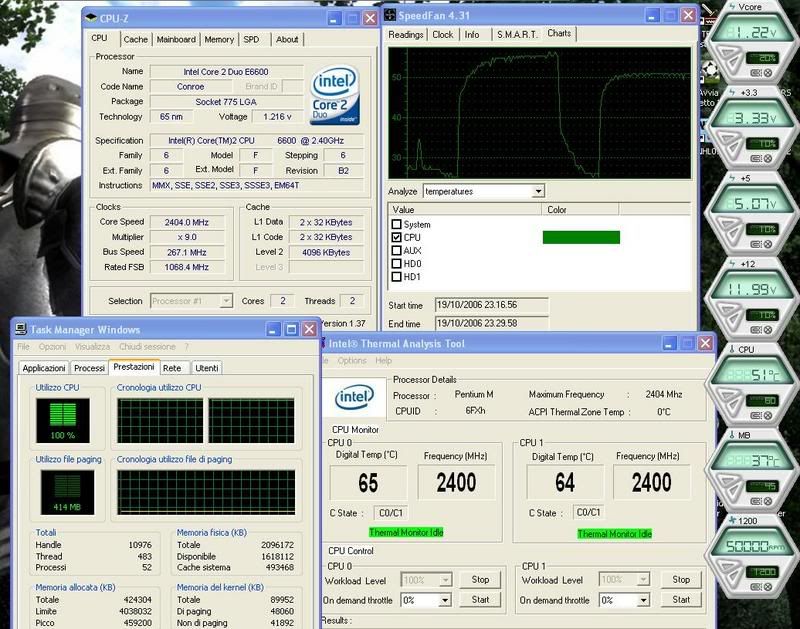 - la CPU è a default, speedstep disinserito (ho dimenticato di mettere la schermata di CPU-Z in effetti...); - da quanto mi è stato riferito riguardo a TAT (mio cugino, una delle circa 2'500 persone rappresentanti ufficiali di Microsoft in Europa e parecchio ferrato in fatto di software), sembra che sia un software che è stato sviluppato da qualche tempo ormai e sulla base di chipset non recentissimi. Ho esposto a lui il problema delle temperature elevate che mi rileva e mi ha detto che non si fiderebbe troppo, soprattutto con un chipset 975x (come quello della mia asus). Da allora lo uso solo perché è comodo per mandare la CPU al 100% di load. Quanto mi ha detto inoltre, lo ritengo plausibile anche visti i risultati presenti in un altro post (Database ufficiale temperature conroe, o qualcosa del genere) dove gente con il PCProbe della Asus P5B ottiene temperature più alte che con il TAT (nell'ordine di almeno 5 gradi). La cosa è alquanto strana, dunque non so se fidarmi troppo di quel programma francamente; - Il case è un NZXT Lexa con una ventola laterale da 12x12, una posteriore da 12x12, una frontale (HD) da 12x12 (mi sembra) oltre alla ventola da 12x12 della PSU (Raptoxx Exxtreme 600 Watt); - la temperatura interna del case per tutta la durata del test è stata nell'ordine dei 25°. |