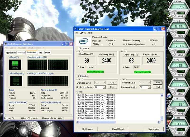 Ho fatto fianlmente i test con lo Zalman al minimo e al massimo. I risultati sono ottenuti con il PC in firma. Temperature secondo TAT e secondo Asus PCProbe II. Francamente quelle del TAT mi sembrano un poco troppo altine e non so se sono esattamente plausibili. Naturalmente le rilevazioni sono in full stress della CPU per 5 minuti interi. Temperatura ambiente 22°C stabili.