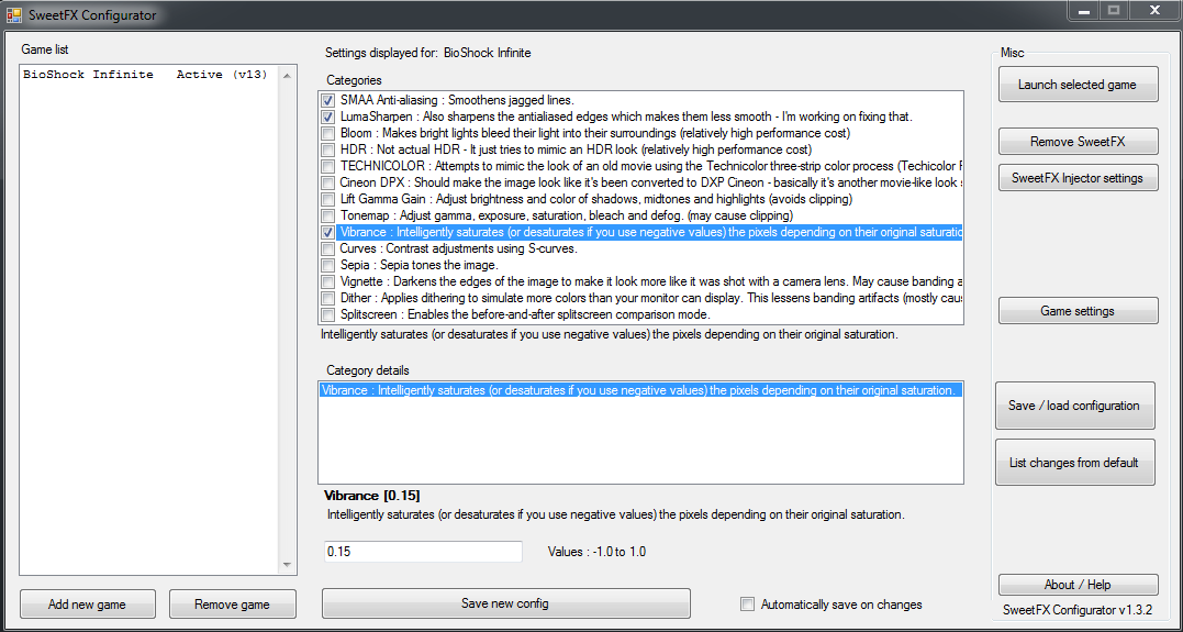 io in bioshock ho attivato il lumasharpen (aumenta la nitidezza), SMAA (si sa che fa), il dpx (gli ho aumentato il blu, per dargli un immagine + fredda), ed il curves (questa opzione lo fa diventare + contrastata la grafica).