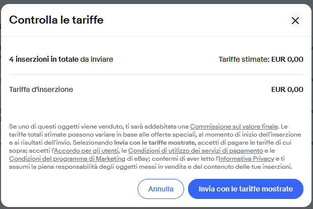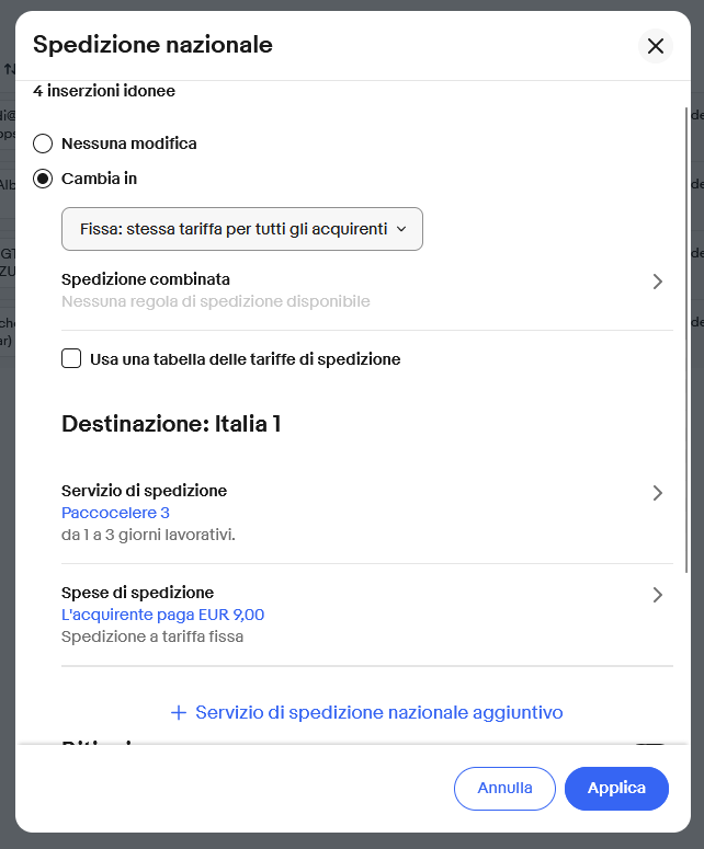 Se usi la console, puoi provare a selezionare più inserzioni e procedere ad una modifica in massa (esempio spese di spedizione nazionale). Prova lì ad apportare qualche modifica e confermare con Applica.