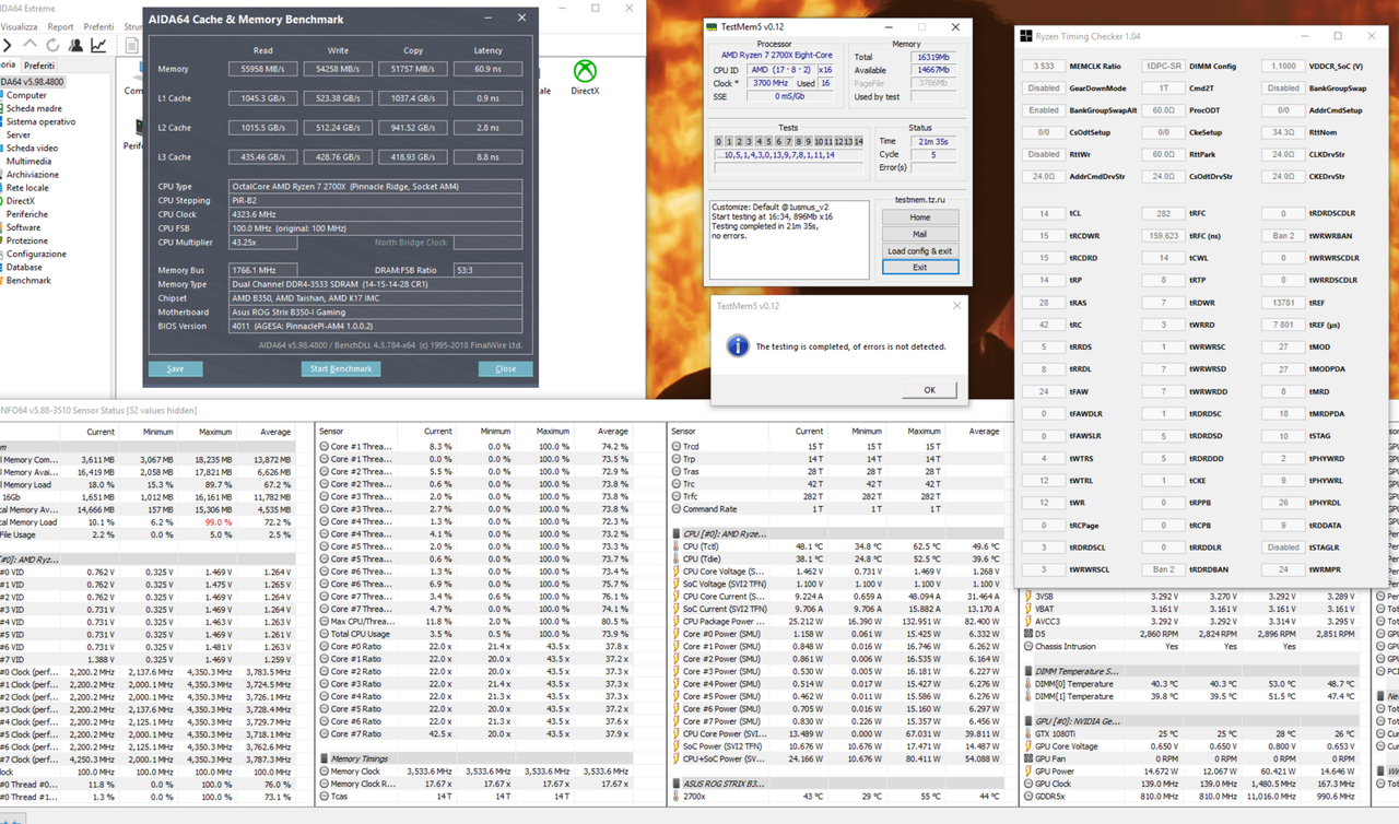 Certo che dall'altra parte (i blu) devono cominciare ad avere parecchi dubbi sull'idolo che hanno scelto e sulla sua politica... io ne avrei, ma non faccio testo, ho il sangue rosso dalla nascita. Mi spiace per Digieffe, mi era simpatico e sembrava essere obiettivo. Non è che porto rancore contro Intel e la sua politica (non solo economica e finanziaria ma soprattutto di marketing) ma l'effetto Zen è semplicemente fantastico. Vedere il mio "nemico-nemesi" suicidarsi davanti ai miei occhi e con le sue proprie mani è una soddisfazione che solo una vendetta sa regalare. E sono stato tutto il tempo con il mio 8350 sulla riva del fiume ad aspettare (zen...) Tornando a discorsi più del thread, vorrei segnalare che ho la ram 3600c16 della GSkill (anche RGB, per la cronaca ![]() ![]() ![]() Ci sono arrivato abbassando i timings del 3466 MHz (usando come base il preset di TheStilt a 3200 fast) da c14 a c13 e poi alzando la base da 100 a 101 MHz (finalmente dopo tanti mesi, con ultimo bios Asus C6H 6301). Tensione della ram da 1,4V a 1,44V e Vsoc a 1,1. Ormai fisso a 4040 MHz da settembre (prima a 4,0GHz per via dei bios e del caldo). Tensione della CPU a 1,4 da bios, con LLC a livello 2. Mi tiene 1,33 con IBT AVX e OCCT segna 1,32). Questo è uno screen per comparazione e per chi lo trovasse utile. [IMG] ![]()