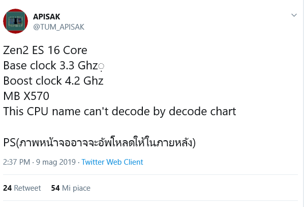 Zen 2 ES 16 core Base clock 3.3ghz Boost clock 4.2ghz Per la versione finale penso che +300mhz siano fattibili Inviato dal mio Pixel 2 XL